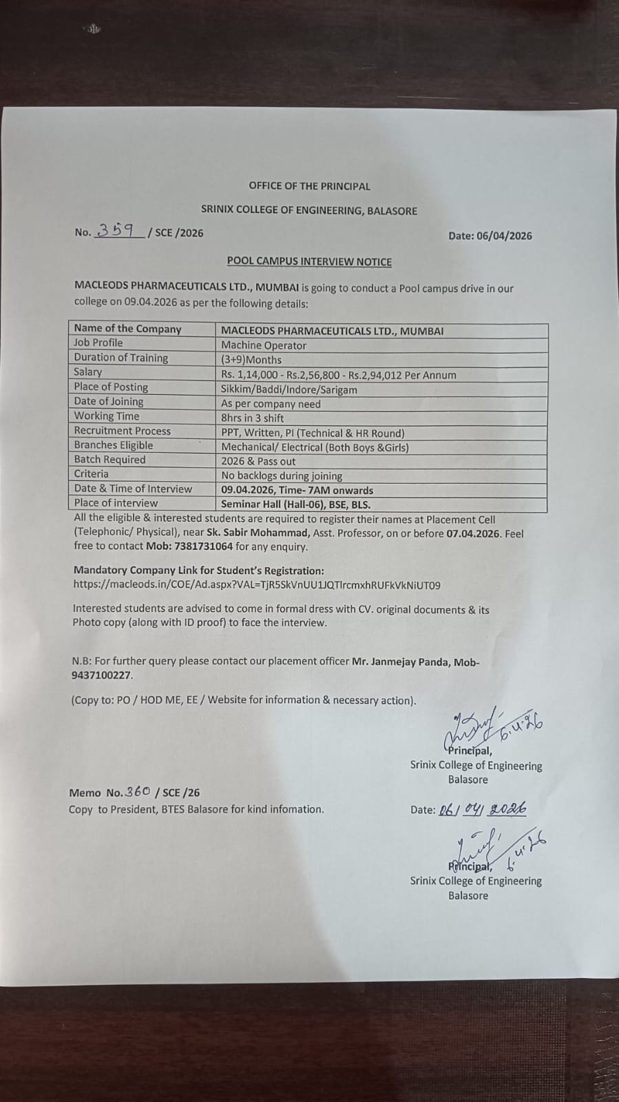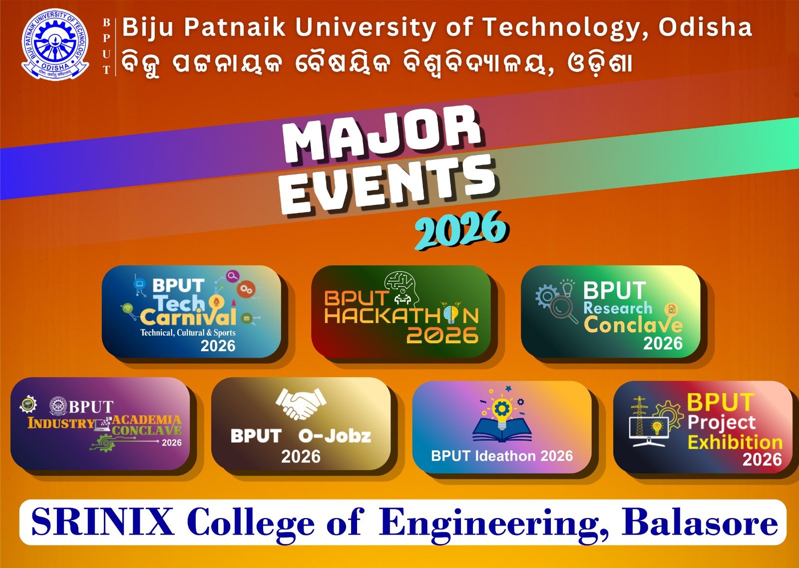 09-3-2026 information of all stake holders (Stuclents. staft members. parents) that the schedule for dirferert academic activities of BPUT- Rourkela for the ensuing even semester 25-2-2026 first Internal exam. of 6th semester 2026 18-2-2026 Schedule for different academic activities of BPUT Rourlkela for the ensuring even semester 2026 05-2-2026 Aliah University, KolkataQ.(Newtown)is going to conduct a off campus drive on 18.02.2026 10-1-2026 Notice regarding B.tech 1st & 3rd yr and 1st yr MBA ,MCA student , BPUT examination 2026 19-12-2025 Notice regarding Project Exhibition 24th December 2025 11-12-2025 Notice regarding form fillup of 1st. sem of all department students 2025 11-12-2025 Notice regarding Annual sports 2025. 10-12-2025 Notice regarding Balasore Utsav 2025. 2-12-2025 Office Order 2025. 2-12-2025 Graduation Day 2025. 2-12-2025 Annual sports 2025. 2-12-2025 Internal Exam 1st and 3 rd sem. 2025. 26-8-2025 Ganesh Puja Celebration 2025. 14-8-2025 79th Independence Day Celebrations 2025. 8-8-2025 Holiday on account of Rakhshya Bandhan2025. 6-8-2025 Inaugural Ceremony 2025. 12-7-2025 Notice for only Mechanical and Electrical passout student regarding free training 2025. 10-4-2025 Notice regarding Summer Iternship 2025. 10-4-2025 Blood donation camp 2025. 8-4-2025 2nd Internal Exam. for 6th Sem B.Tech. 2025. 7-4-2025 Notice regarding Tentative Exam for even sem 2025. 29-3-2025 Holiday for Eid-ul-Fitar & Utkal Diwas and 2025. 7-2-2025 Graduation Day 2025. 22-10-2024 Notice regarding anticipating cyclonic strom . 16-8-2024 Notice regarding 1st internal examination of 5th and 7th . 14-8-2024 Notice regarding commemorate 78th Independence day on 15 August 2024. 9-8-2024 Notice regarding forth coming Independence day celebration 2024. 7-8-2024 Notice regarding industrial tour of final year electrical engineering student. 1-8-2024 Notice regarding registration of coursera programme . 23-7-2024 Notice regarding lateral Entry category of student admission 2024 . 22-7-2024 Notice regarding NPTEL subject registraion . 06-7-2024 Notice regarding Ratha Yatra Holiday 2024. 25-4-2024 Notice for 2nd and 4th semester student regarding first internal exam Schedule . 10-4-2024 Holiday on account of Eid-ul-Fitar 2024. 10-4-2024 Notice for 4th and 6th sem students regarding 1st internal examination. 10-4-2024 Notice for 2nd sem students regarding 1st internal examination. 10-4-2024 Notice regarding pending dues of 2,4,and 6th sem students. 10-4-2024 Notice regarding pending dues of 8th sem students. 10-4-2024 Notice regarding Sessional examinations. 2-4-2024 Notice regarding lnspection by AICTE 2024. 2-4-2024 Notice regarding blood donation camp 2024. 29-2-2024 Notice for 2nd and 3rd year students of Electrical Engineering. 23-2-2024 Notice for B.Tech and MBA student regarding registration fees. 30-1-2024 Annual sports at Srinix 2024 . 21-1-2024 Online training of high end-end digital course for student . 21-1-2024 Half day college close for Soul Installation of Rama Lalla. 19-1-2024 Notice for all 5th sem student regarding BPUT Exam. 19-1-2024 Notice for all HODs and final year student regarding Major project 27-12-2023 Notice for MBA student 27-12-2023 MBA Exam 2023-2024 27-12-2023 1st semester Exam Scheduled 2023-2024 27-12-2023 3rd semester Exam Scheduled 2023-2024 27-12-2023 Notice for 3 rd & 1stsem student regarding BPUT end Semester Examination 20-12-2023 Notice for 5 th sem student regarding Semester Examination 18-12-2023 Beware of fraud calls regarding payment of dues/fines in name of Srinix Engineering college 16-12-2023 Talk on New Education Policy-2020. 9-12-2023 Notice regarding BPUT Exam. 7-12-2023 2nd internal Exam of 5th sem students 4-12-2023 Notice for Prathamastamai 29-11-2023 Notice for 1 st & 3 rd Sem Student for their semester registration 29-11-2023 Notice for 7 th Sem Student to clear all final year dues 28-11-2023 2nd Internal Exam for 7 th Sem Student 23-11-2023 Study Tour of 2nd yr. Computer Science & ENgineering 20-11-2023 A one day orientation lecture on"Developing Entrepreneurship skili attiiude, and beiavior and programme" 9-11-2023 workshop on Computer Assembling for 5th & 7th sem. students 18-10-2023 Notice for Odd semester Internal Exam 2023. 06-10-2023 Notice for 5th and 7th students for regarding registration and dues 03-10-2023 Notice for the student for participating in Amrit Kalas Yatra 25-09-2023 Expert talk on stress management 7-09-2023 BPUT academic calenclar for the year 2023-24 5-09-2023 BPUT vide 1-09-2023 Notice for the induction programme 5-08-2023 Notice for College Timing 2-08-2023 Notice for Upcoming Even Semester Examination-2022-23 27-07-2023 Notice to all students and staff members on the eve of Muharram on 29-07-2023 14-07-2023 Notice for the Mechanical Student to attend the seminar 23-5-2023 Notice for the student not doing lab classess 2-5-2023 Notice to the 6th semester student for the seminar 3-4-2023 Notice to the 1st semester student for collecting clearance 25-1-2023 Observation of Republic Day-2023 25-1-2023 Internal Examination Schedule 10-1-2023 Campus Interview 2-1-2023 Supplimentary Examination of 2019-20, 2020-21, 2021-22. 21-12-2022 Attention for 1st, 3rd , 5th semester students 14-12-2022 Notice for 2nd,3rd4th semester student of Civil Engg to attain semeinar. 12-12-2022 Blood Donation Camp on 17-12-2022. 2-12-2022 Notice for all Students and Staff Members Regarding Annual Sports. 23-11-2022 Notice for 1st and 3rd Semester Students for Re-Checking of Answer Scripts. 14-11-2022 Exam Schedule of 2nd Semester 2021-2022 from 18-11-2022 to 03-12-2022 . 14-11-2022 Exam Schedule of 4th Semester 2021-2022 from 17-11-2022 to 06-12-2022 . 29-10-2022 Technical Talk on Advanced Wireless Communication organized by the Department of Electrical Engineering on 5-11-2022. 10-10-2022 Campus Interview Notice. 1-10-2022 Notice For 2nd and 4th semester students pratical Exam. 30-09-2022 Notice Regarding College Timing 29-09-2022 Faculty Development Pr